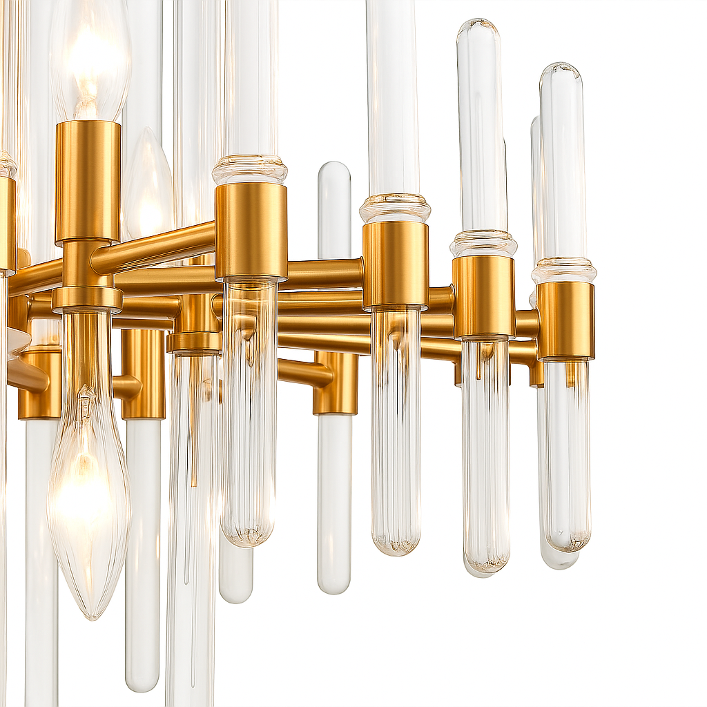 Its layered glass tubes diffuse light beautifully, offering a warm and inviting glow while highlighting the gold body for a rich aesthetic. Perfectly sized for medium to large rooms, this statement piece brings elegance and character to your home or commercial space.
