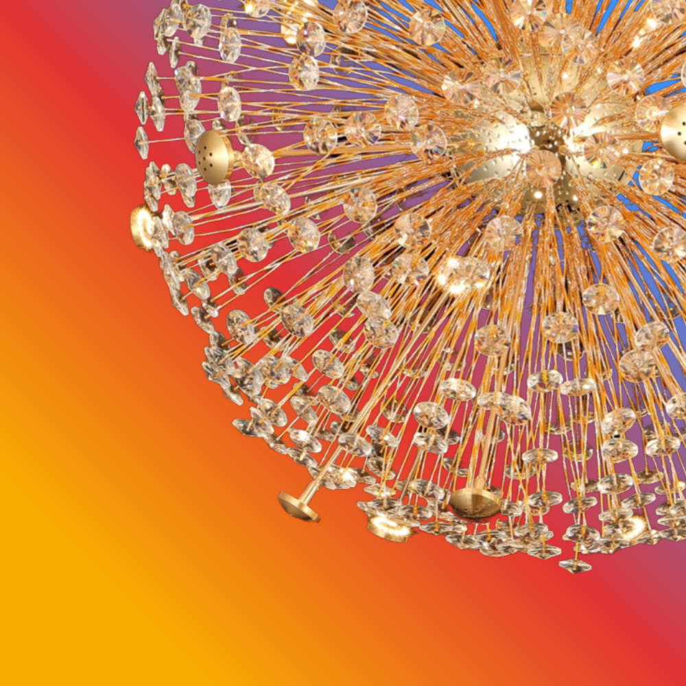 This spherical chandelier is crafted with hundreds of fine metal rods branching outward, each adorned with premium faceted crystal accents that scatter light in every direction. The warm golden glow creates a dramatic visual effect, illuminating interiors with brilliance and sophistication.