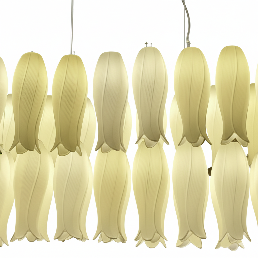This unique chandelier features beautifully crafted tulip-shaped glass shades suspended in layers, creating a cascading waterfall effect.